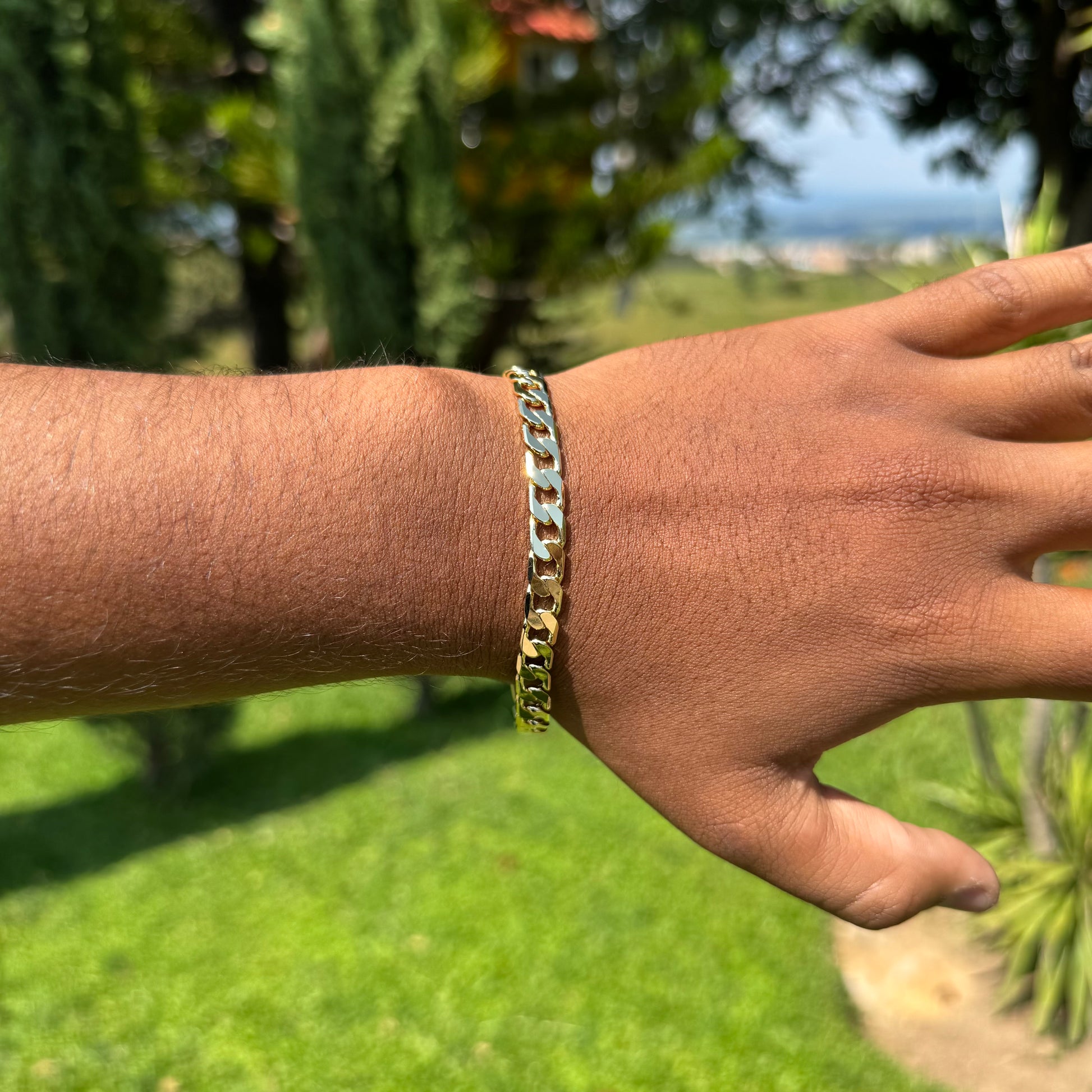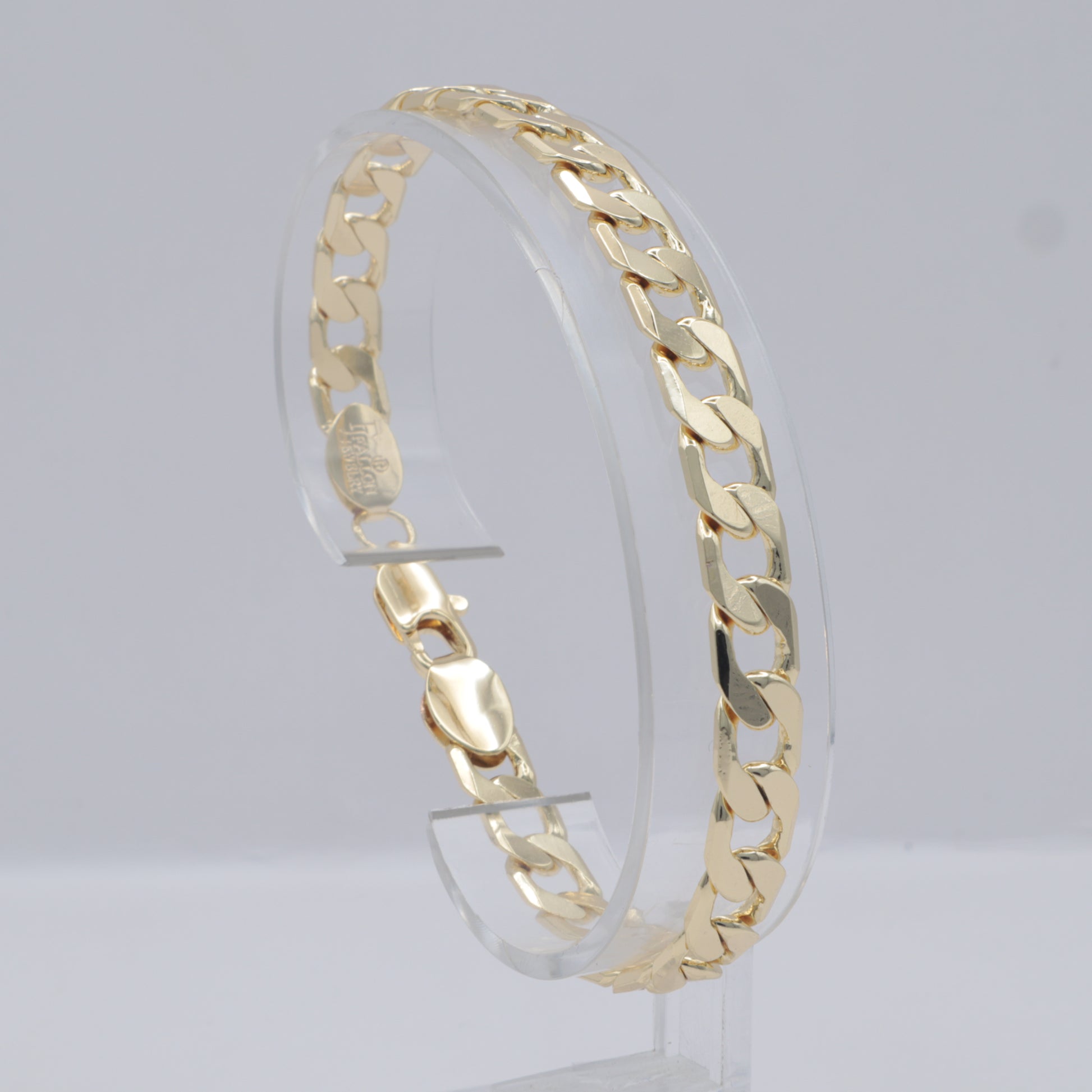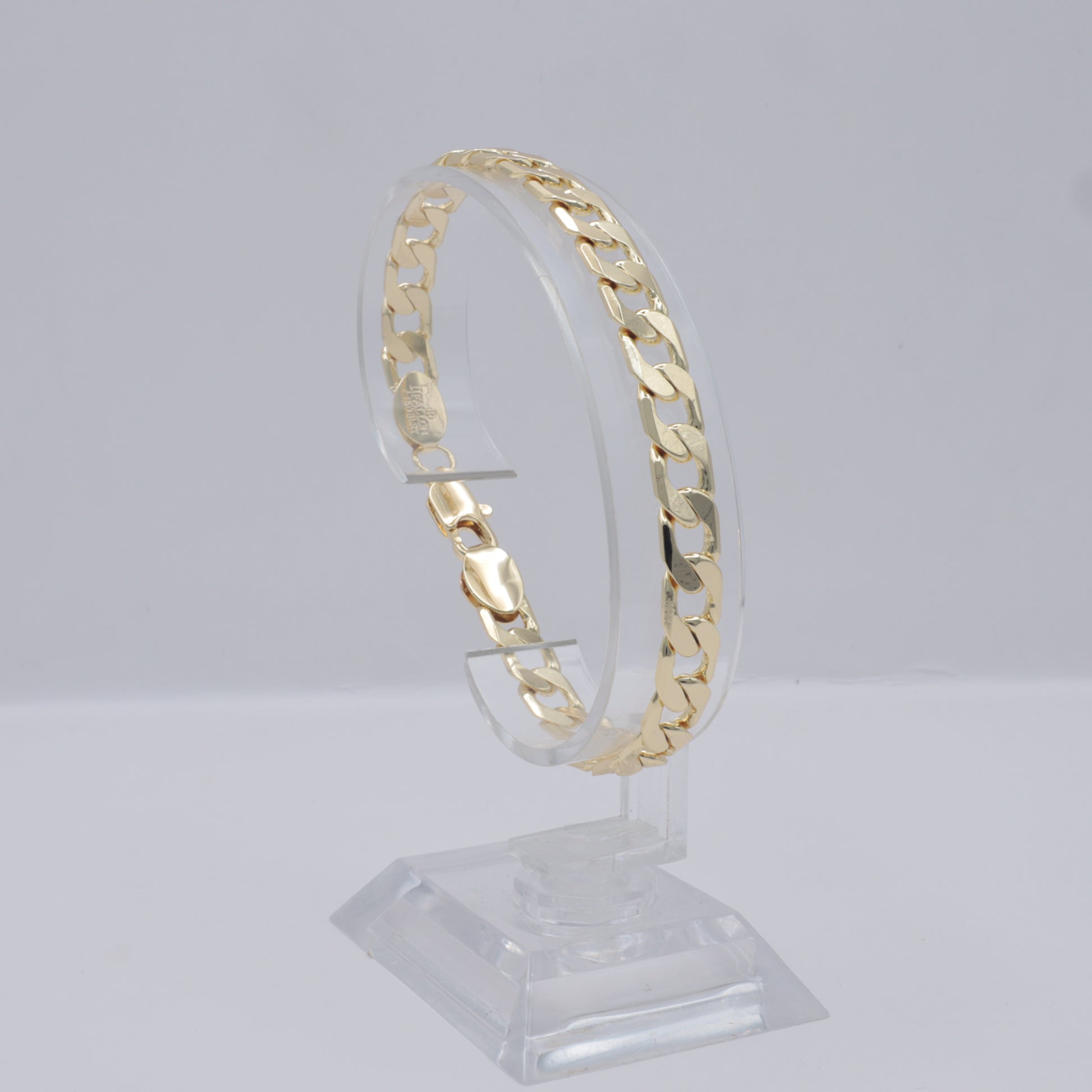 Este pulso de oro laminado 14K de 21 cm de largo y 7 mm de ancho destaca por su diseño barbado que combina elegancia y distinción. Su acabado refinado ofrece un brillo duradero, ideal para complementar cualquier estilo con sofisticación y sutil lujo. Perfecto para quienes buscan una pieza clásica con un toque contemporáneo.