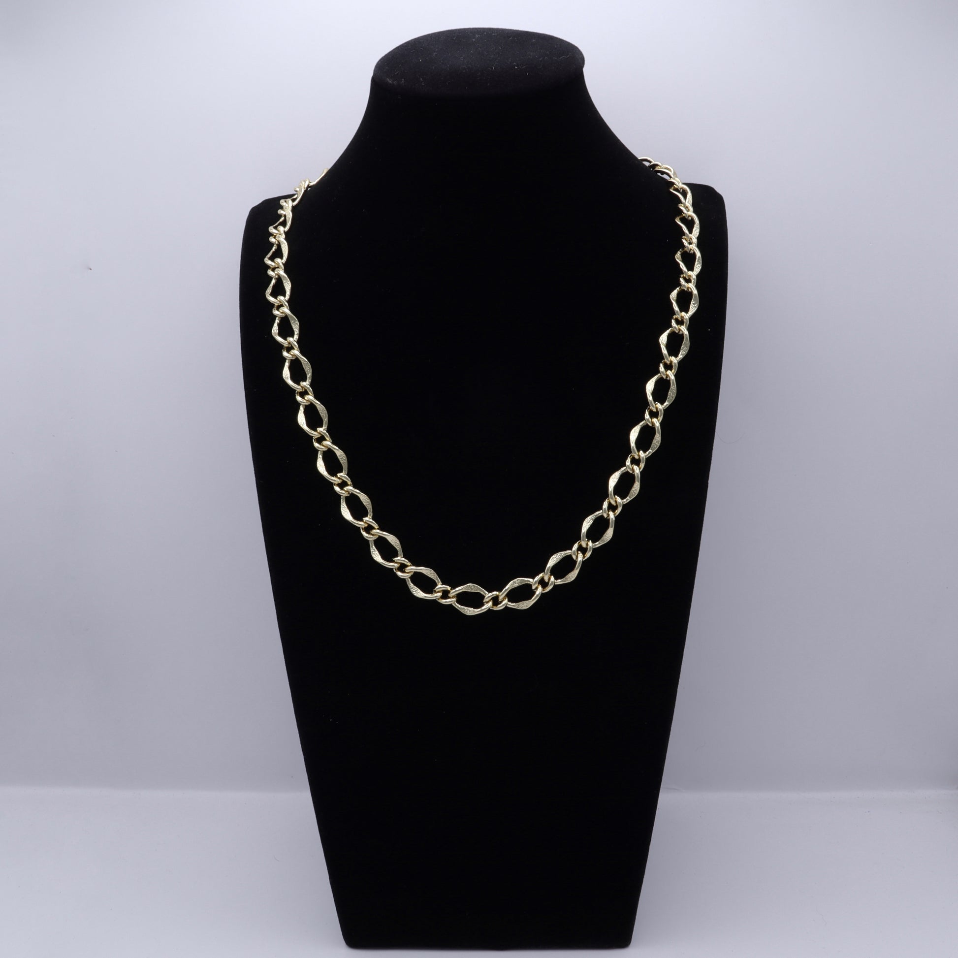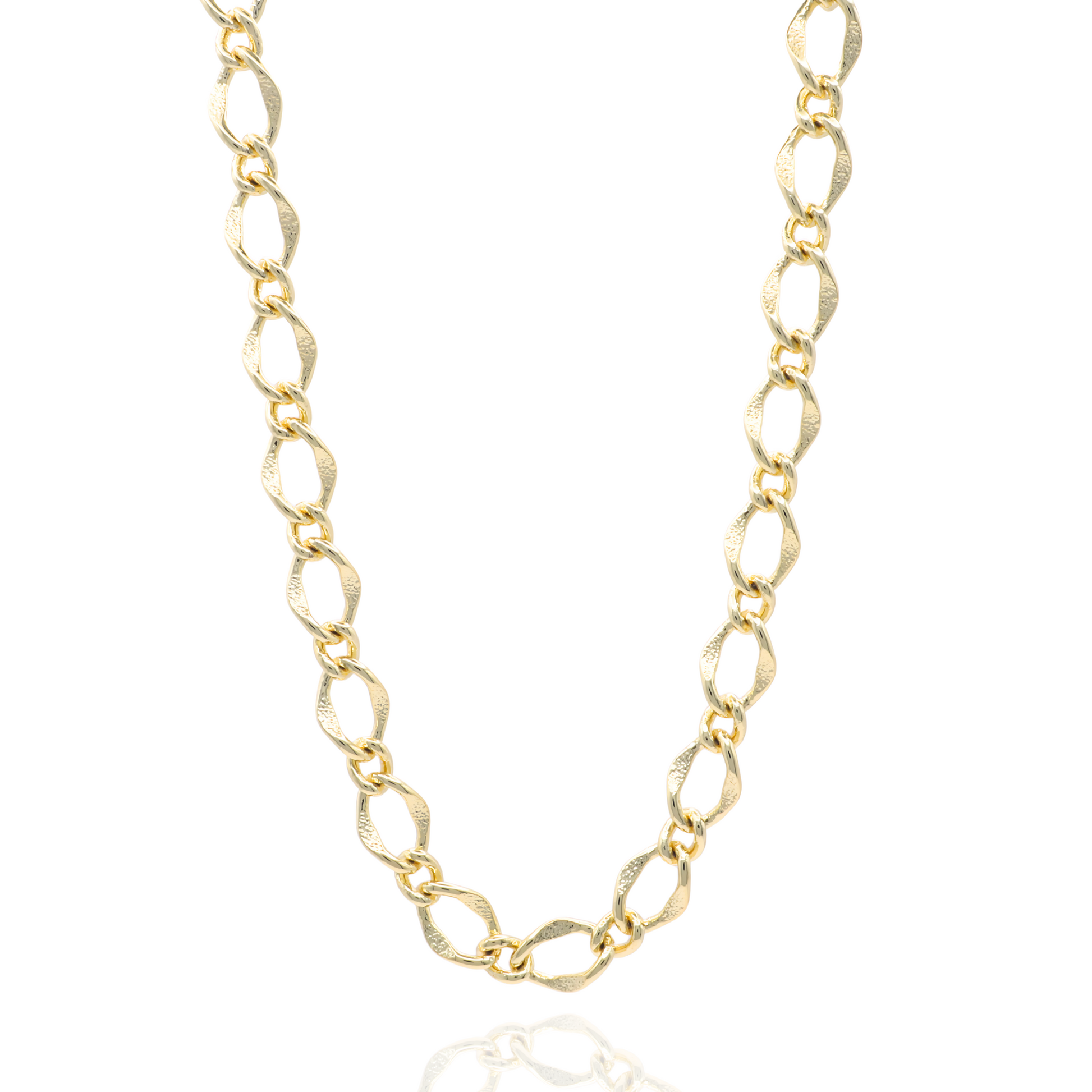 Elegante collar Curb Figaro con textura distintiva, elaborado en oro laminado de alta calidad. Sus eslabones de 10mm ofrecen un equilibrio perfecto entre presencia y sofisticación, mientras que su longitud de 50 cm permite adaptarse a diversos estilos. Una pieza atemporal que realza cualquier atuendo con un toque de distinción y refinamiento.